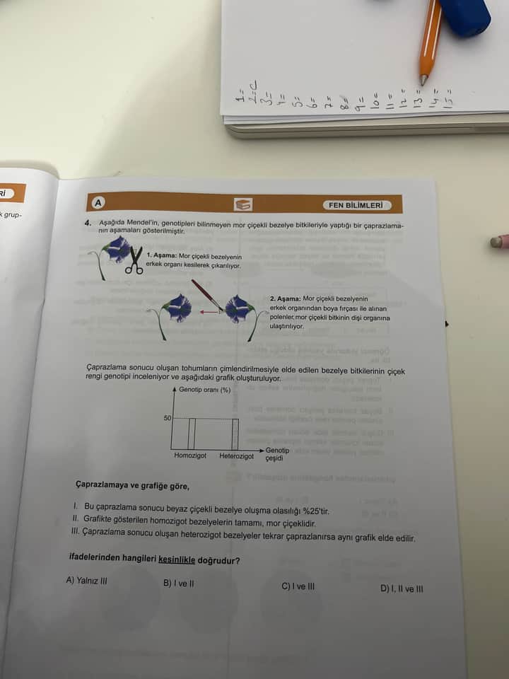 - “Grafikteki homozigot bezelyelerin tamamı mor çiçektir.” → Yanlış; homozigotlar %25 PP (mor) ve %25 pp (beyaz) olarak ikiye ayrılır.