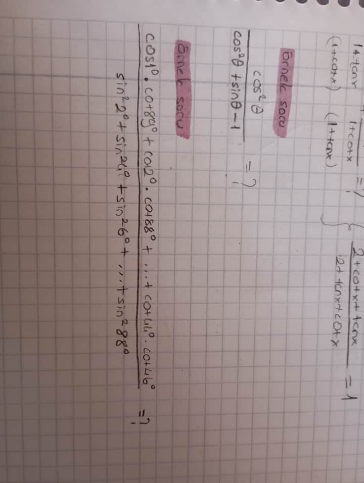 - İkinci soruda trigonometrik açıların tamamlayıcılık özelliği ile paydaki ifadeyi \sin \theta cinsine çevirdik. Ancak açılar tam net olmadığı için kesin sonuç veremedik.