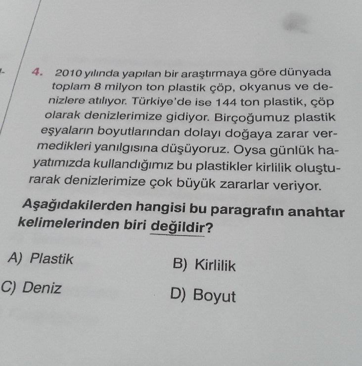 - 2010 yilinda yapılan bir araştırmaya göre dünyada toplam 8 milyon ton plastik çöp, okyanus ve de- nizlere atiliyor. Türkiye’de ise 144 ton plastik, çöp olarak denizlerimnize gidiyor. Birçoğumuz plastik eşyaların boyutlarından dolayı doğaya zarar ver- medikleri yanılgısına düşüyoruz. Oysa günlük ha- yatımızda kullandığımız bu plastikler kirlilik oluştu- rarak denizlerimize çok büyük zararlar veriyor. Aşağıdakilerden hangisi bu paragrafın anahtar kelimelerinden biri değildir? A) Plastik C) Deniz B) Kirlilik D) Boyut