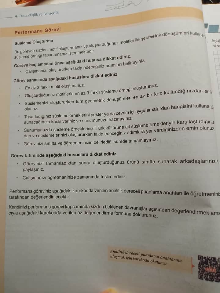 Performans görevi, geometrik dönüşümlerle motifler kullanarak süsleme tasarlamanızı, bu süslemeleri Türk kültüründeki süslemelerle karşılaştırarak sunmanızı sağlar. Bu süreçte takip adımları ve öğretmenin değerlendirme puanlama anahtarıyla öz değerlendirme yapmanız gerekmektedir.