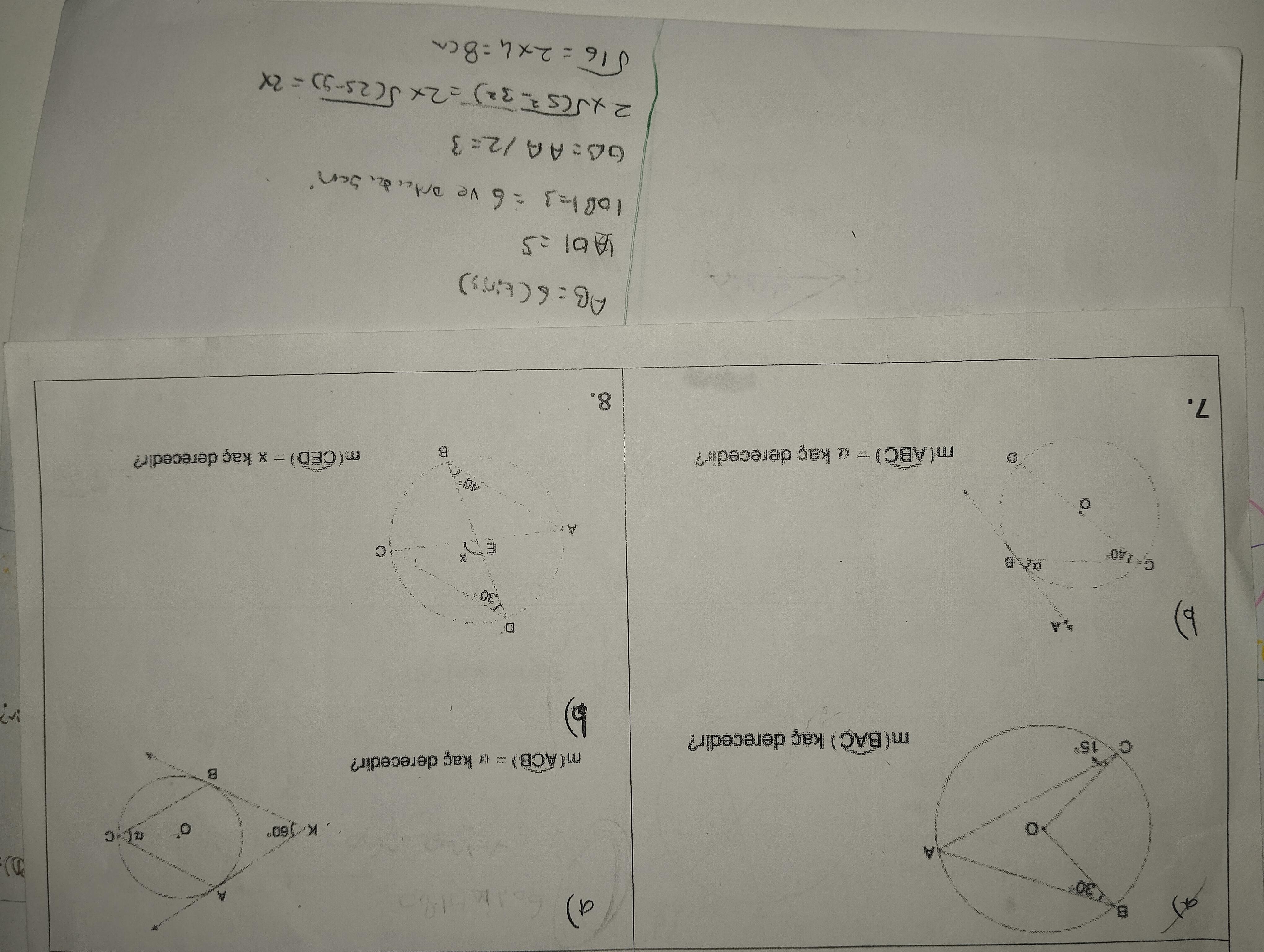 Bu bilgiler ışığında, şekilleri dikkatlice inceleyip hangi açıların hangi yayları gördüğünü belirleyerek adım adım çözümlerinizi tamamlayabilirsiniz. Orijinal sorulardaki rakamlar (örneğin derece ölçüleri) net bir şekilde görünmediğinden, burada genel çözümler ve teoremler paylaşılmıştır. Sorunun birebir sayısal cevabı, fotoğrafta yer alan ölçüler netleştikten sonra bu yöntemlerle kolaylıkla bulunabilir.