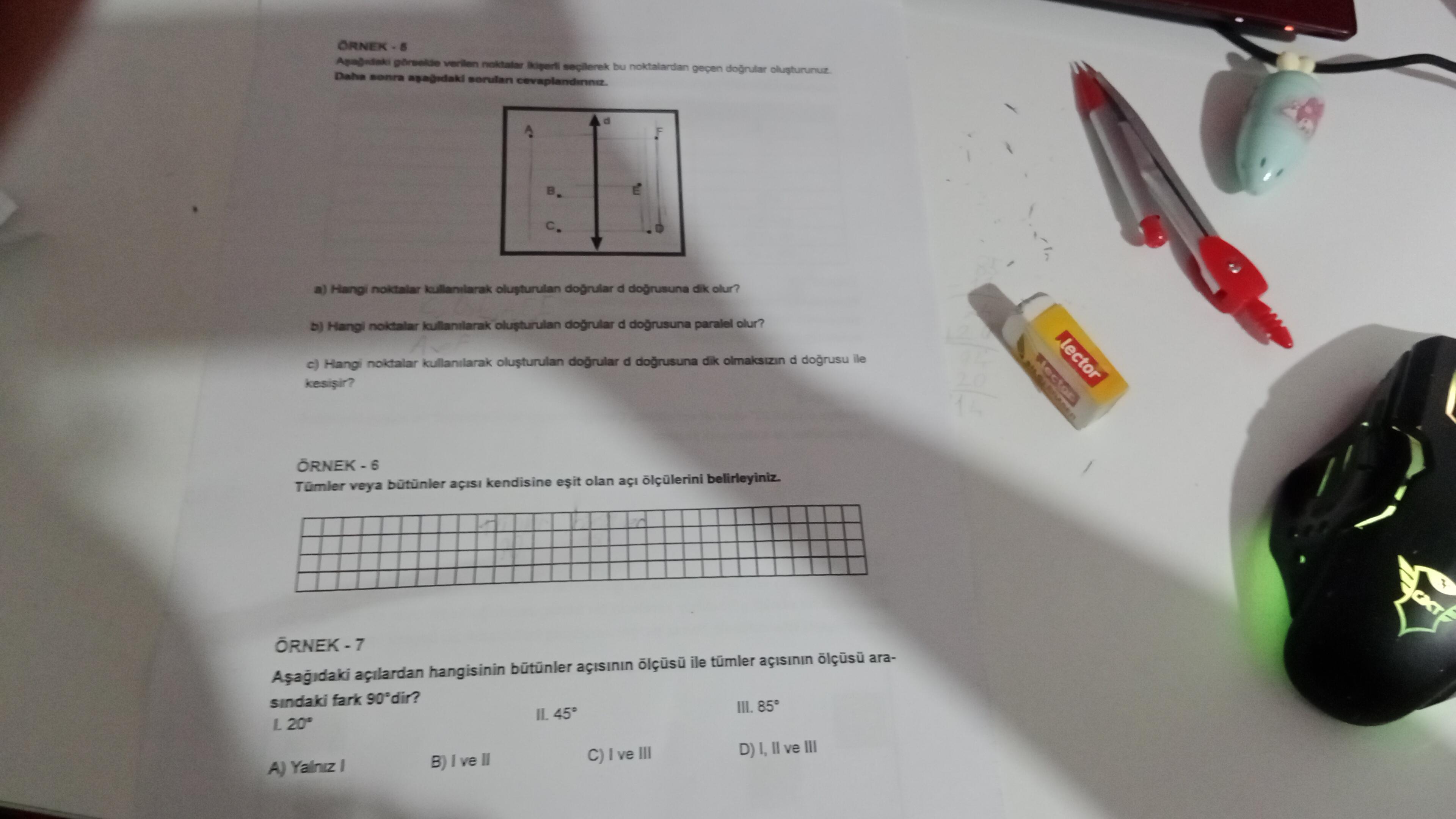 Örnek 7’de, verilen açılardan hangilerinin tümler veya bütünler açı olduğunu soruyor. Seçeneklerde I, II, III gibi ifadeler var.