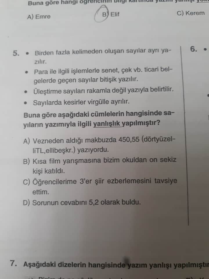 Soru: “Buna göre aşağıdaki cümlelerin hangisinde sayıların yazımı ile ilgili yanlışlık yapılmıştır?”