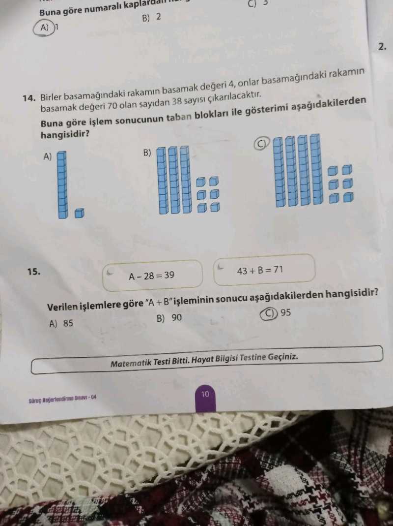Buna göre numaralı kaplart 15. A) 14. Birler basamağındaki rakamın basamak değeri 4, onlar basamağındaki rakamin basamak değeri 70 olan sayıdan 38 sayISI Çikarılacaktır. A) B) 2 Buna göre işlem sonucunun taban blokları ile gösterimi aşağıdakilerden hangisidir? A) 85 Sürec Dejeriendirme Sinav-04 B) C) A- 28 =39 Verilen işlemlere göre "A + B’işleminin sonucu aşağıdakilerden hangisidir? B) 90 43 + B= 71 10 95 Matematik Testi Bitti. Hayat Bilgisi Testine Geçiniz. 2.