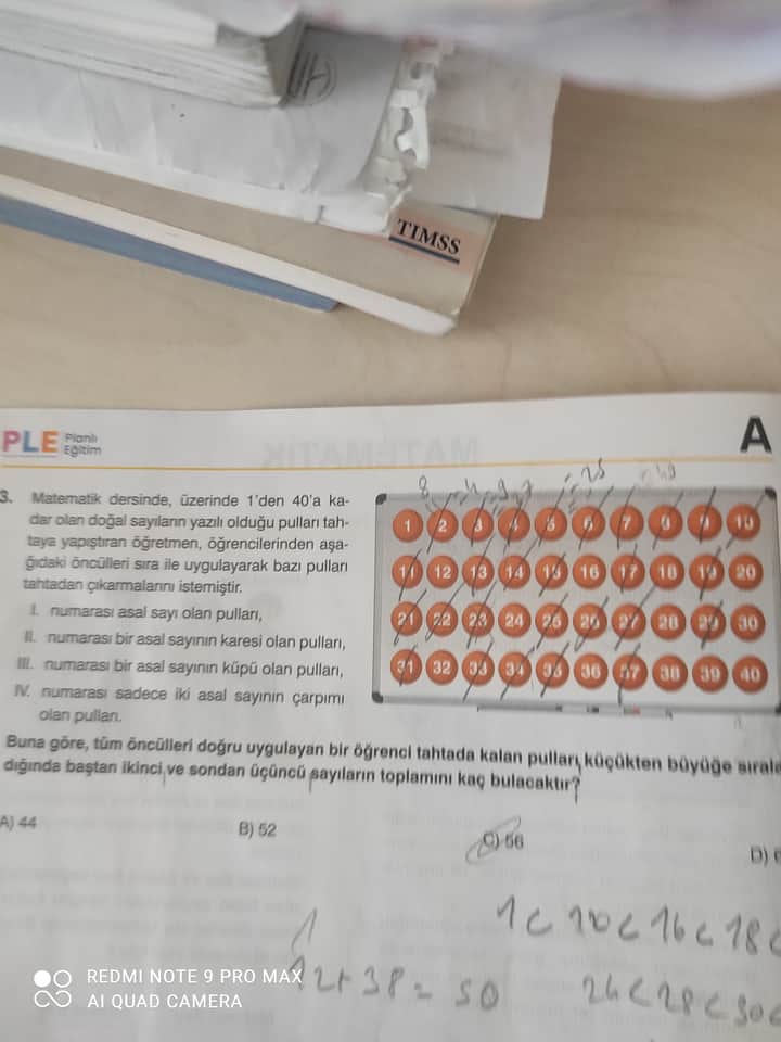 Soruda, tahtadaki pullar üzerine sıralı yazılmış 1’den 40’a kadar olan sayılardan belirli koşulları sağlayanları çıkarıldığı belirtilmektedir. Tüm öncülleri doğru uygulayan bir öğrenci, tahtada kalan pulları küçükten büyüğe sıralayıp baştan ikinci ve sondan üçüncü sayıları toplamaktadır.