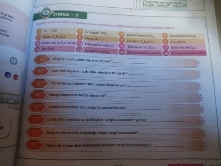 Fotoğraftaki etkinliğe göre verilen soru ve cevaplar için doğru numaralandırılmış bileşikler seçilmiştir. İşte ayrıntılı cevaplar: