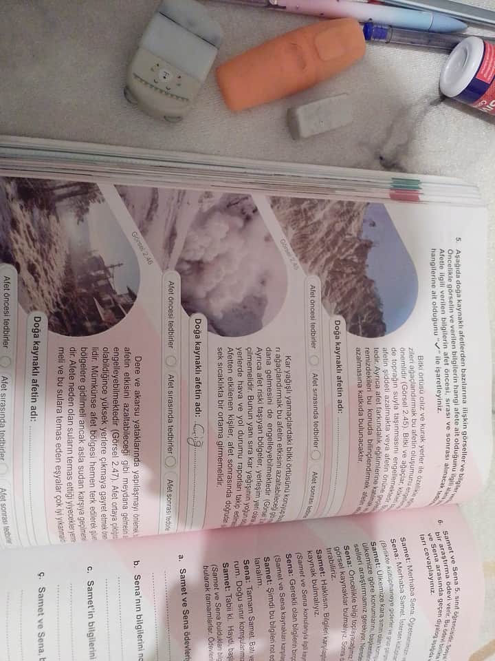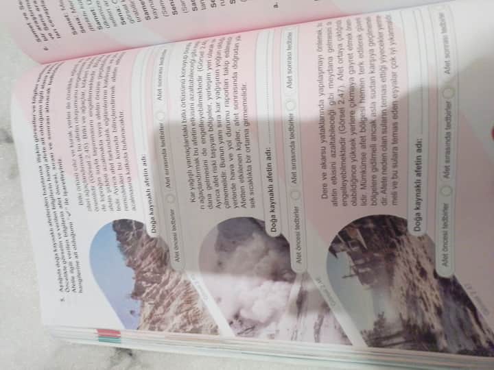 Görsel üzerinde gördüğüm kısımlardan çıkardığım kadarıyla, altta sorular ve yukarıda her biri farklı bir doğal afet veya olayla ilgili görseller yer alıyor. Eğer soruları daha net bir şekilde yazabilirseniz veya sormak istediğiniz spesifik bir konu varsa, bu konuda size daha iyi yardımcı olabilirim.
