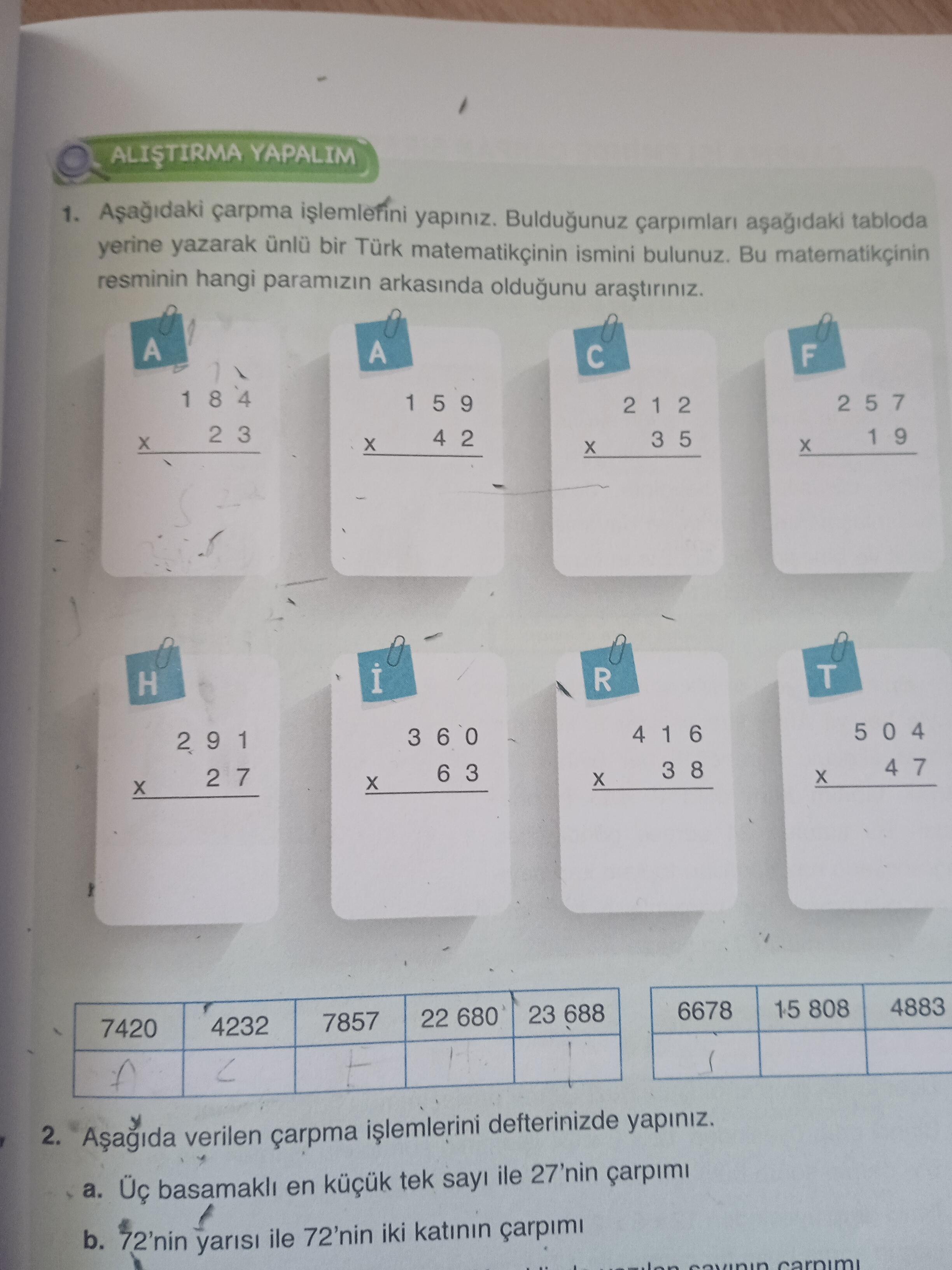 Bu sonuçları, soruda verilen tabloya yerleştirdikten sonra her sayı bir harfle eşleşerek C A H İ T A R F ismini oluşturur.