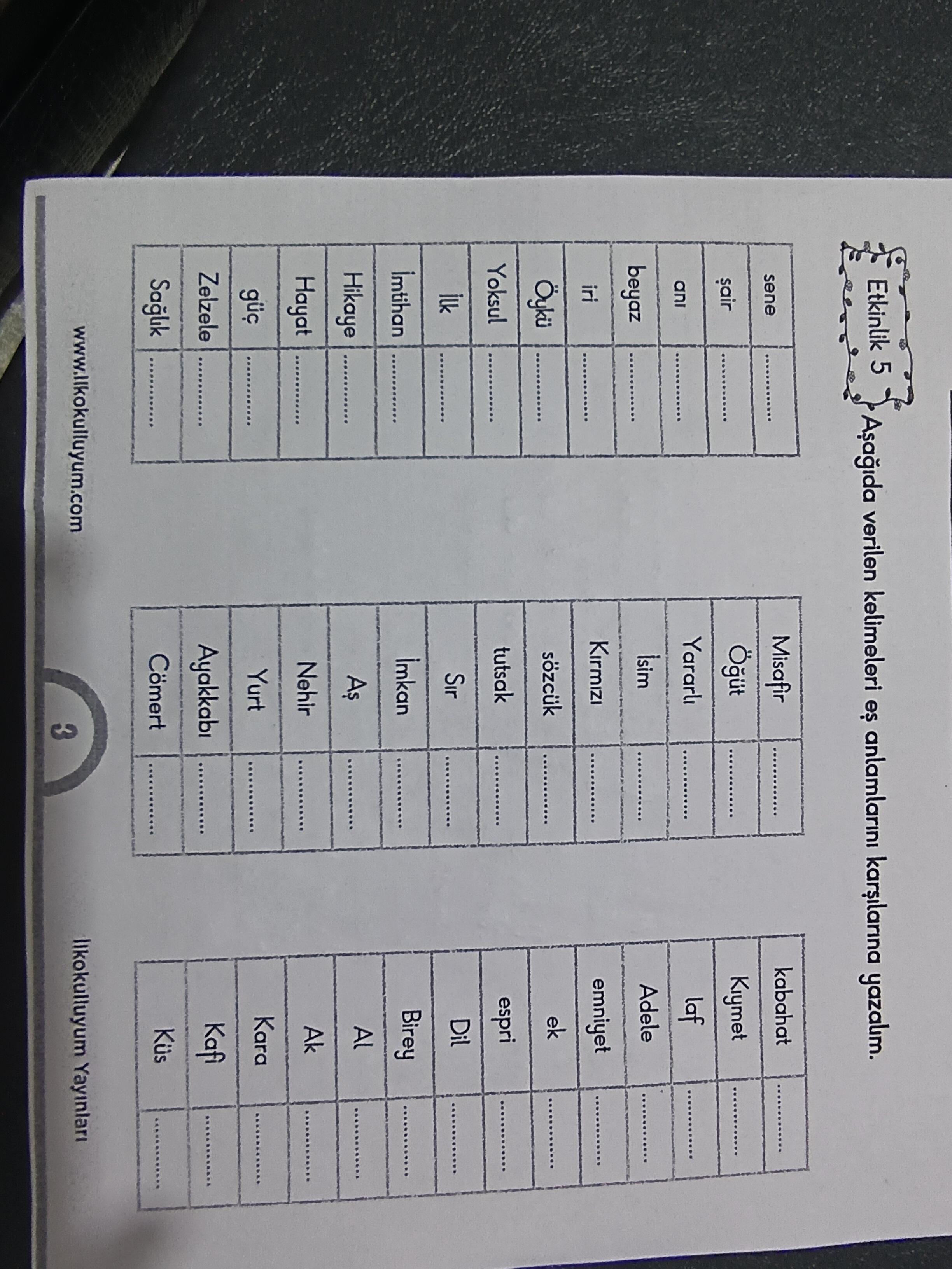 Aşağıda adım adım nasıl yapacağını örnekledim. (Fotoğraf net olmadığı için kelimeleri yaklaşık kabul ettim; sen kendi sayfadaki kelimelere göre aynısını uygulayabilirsin.)