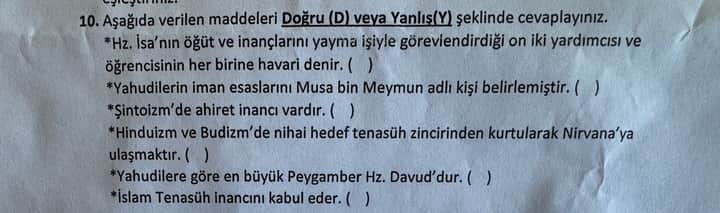 | 2. Yahudilerin iman esaslarını Musa bin Meymun adlı kişi belirlemiştir. | Y | Yahudi inanç esaslarını Musa peygamber ortaya koymuştur. Musa bin Meymun, Ortaçağ’da yaşamış ünlü bir alimdir. |