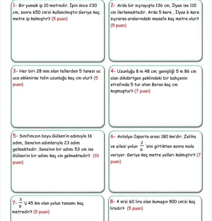 4. Uzunluğu 8 m 48 cm; genişliği 5 m 86 cm olan dikdörtgen şeklideki bir bahçenin etrafında 5 tur atan Boran kaç cm koşmuştur?