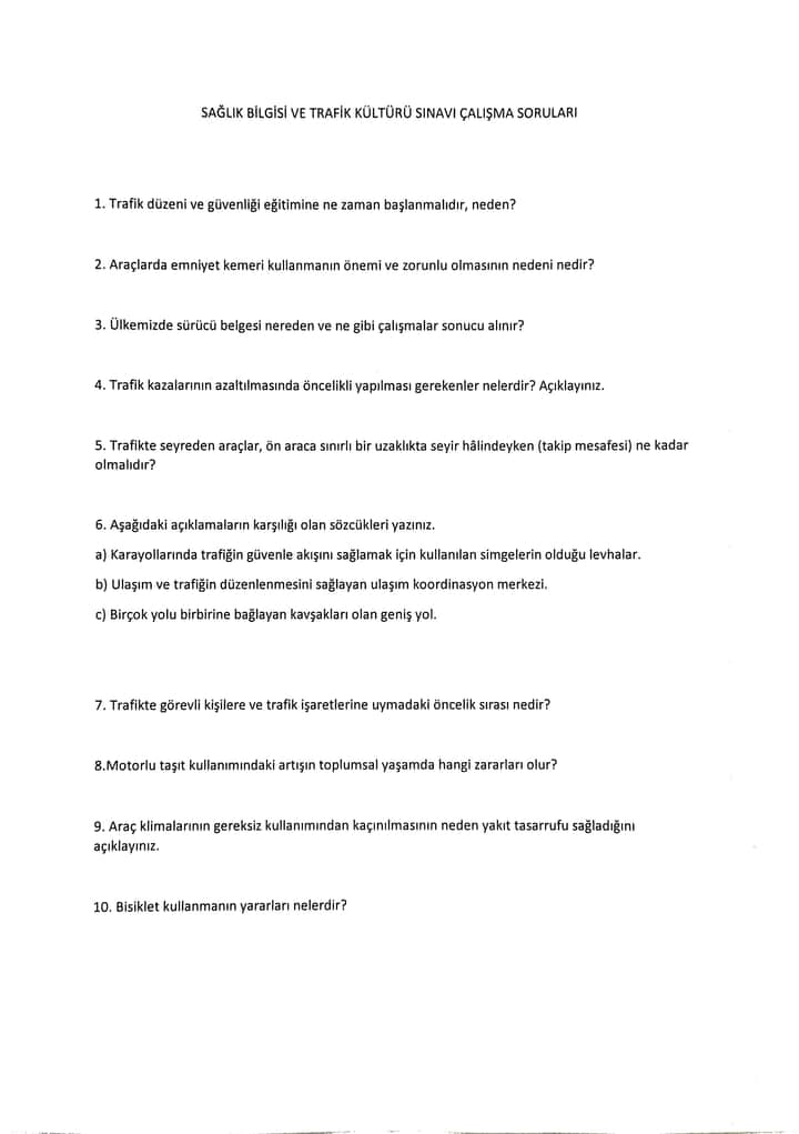 SAĞLIK BİLGİSİ VE TRAFİK KÜLTÜRÜ SINAVI SORULARI CEVAPLARI