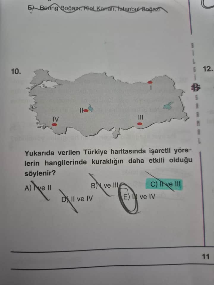 Soruda, bir Türkiye haritası üzerinde I, II, III ve IV ile gösterilen dört ayrı bölgenin hangilerinde kuraklığın (yağış azlığı ve buna bağlı olarak bitki örtüsü ve tarımsal faaliyetlerde görülen su yetersizliği) daha etkili olduğu sorulmaktadır. Seçeneklerde bu bölgelerin çeşitli kombinasyonları verilmiş olup doğru cevap I ve III olarak belirtilmiştir.