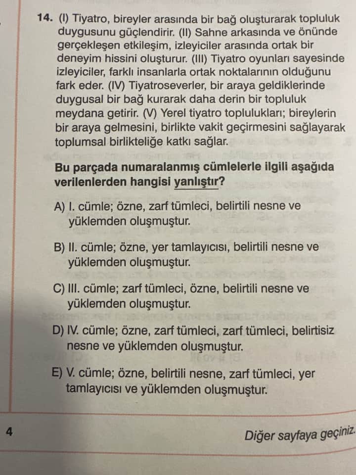| IV | Tiyatroseverler, bir araya geldiklerinde duygusal bir bağ kurarak daha derin bir topluluk meydana getirir. | Tiyatroseverler | daha derin bir topluluk (belirsiz) | bir araya geldiklerinde, duygusal bir bağ kurarak | meydana getirir | Seçenek D doğru |