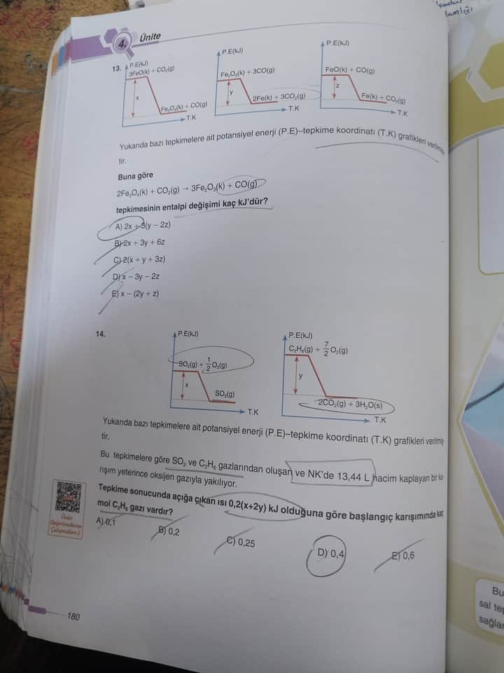 Meva’nın sorusuna cevap vermek için, paylaşmış olduğu görsel üzerinde detaylı bir inceleme yapmam gerekiyor. Görselde kimyasal reaksiyona ait potansiyel enerji (P.E.) - tepkime koordinatı (T.K.) grafikleri ve entalpi değişimleri hakkında bir dizi sorular bulunduğu görülüyor.