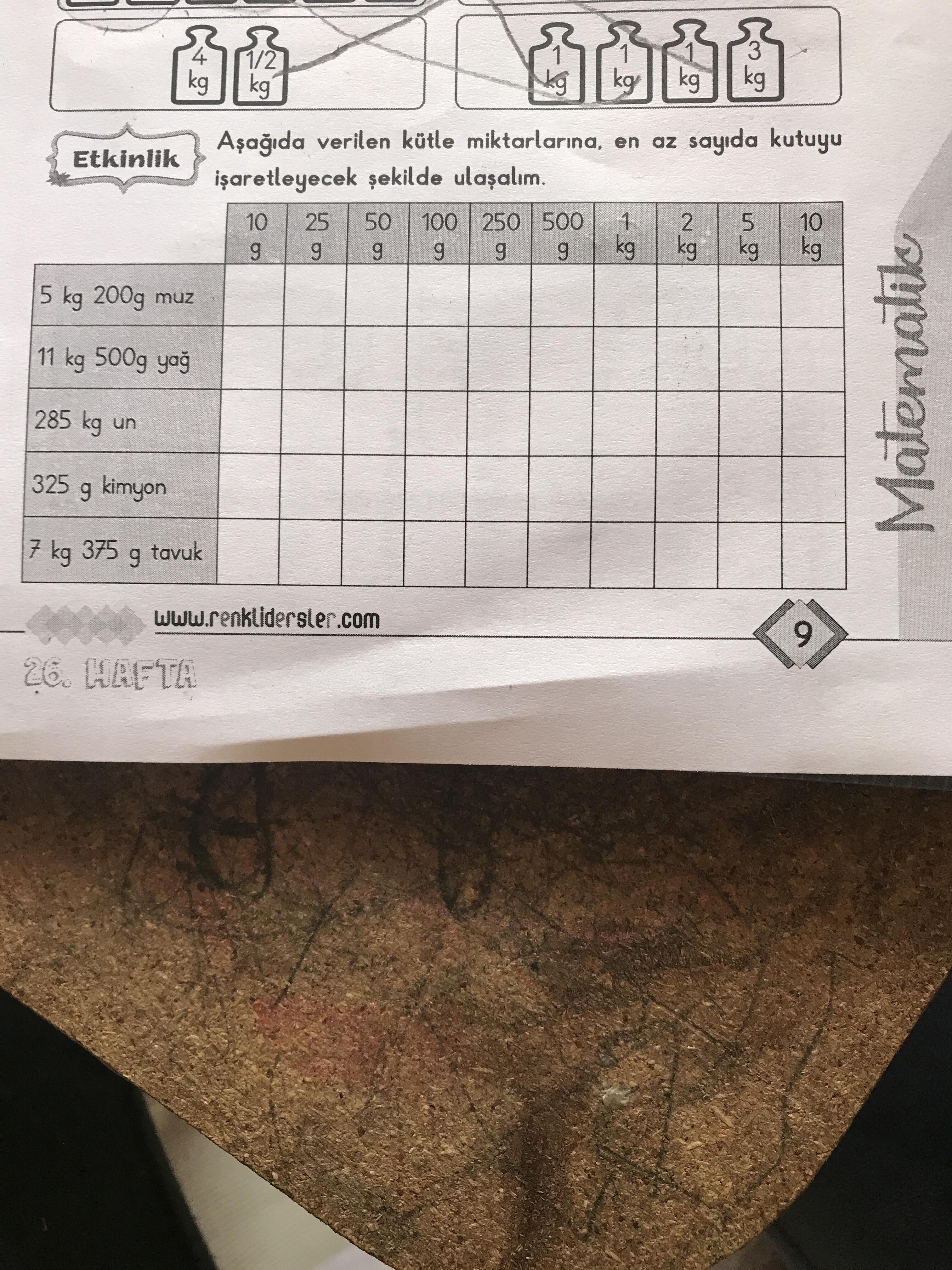 Bu matematik etkinliğinde amaç; verilen kütleleri, yukarıda seçilebilen ağırlıklarla (50g, 100g, 250g, 500g, 1kg) ve en az sayıda kutuya işaret koyarak oluşturmaktır. Her satırdaki kütleyi oluşturmak için en büyük ağırlıktan başlayarak aşağıya doğru azalan bir şekilde toplama yöntemi kullanacağız.