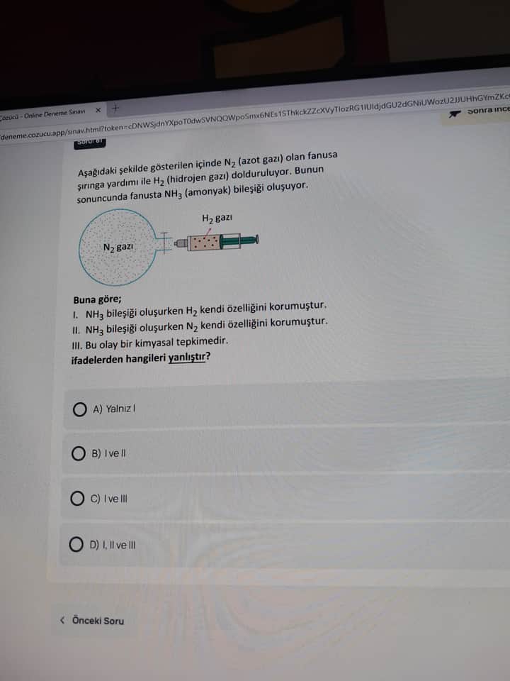 - (Yanlış) NH₃ oluşurken H₂ gazı kendi özelliğini korumaz. Kimyasal reaksiyon sonucu yeni bileşik oluştuğu için H₂ orijinal özelliklerini kaybeder.