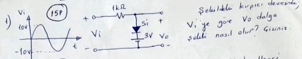 Aşağıdaki açıklamalarda, soru görselinde yer alan ve +10 V ile -10 V genlikli sinüzoidal bir giriş (Vi) kullanan şekilli kırpıcı (clipper) devresinin çıkış dalga şeklinin (Vo) nasıl oluştuğunu adım adım inceleyeceğiz. Veri olarak, devrede 1 kΩ seri direnç ve “Si” (silikon) diyot sembolü üzerinde “3 V” ifadesi görülmektedir. Bu “3 V” ibaresi bazen referans voltajı (örneğin bir batarya veya zener) olarak alınır; ancak tipik bir ileri yönlü polarmalanmış silikon diyotun iletim eşiği yaklaşık 0,7 V’tur. Devrede “3 V” ise ek bir klipleme ya da sabit ofset noktası olarak yorumlanabilir.