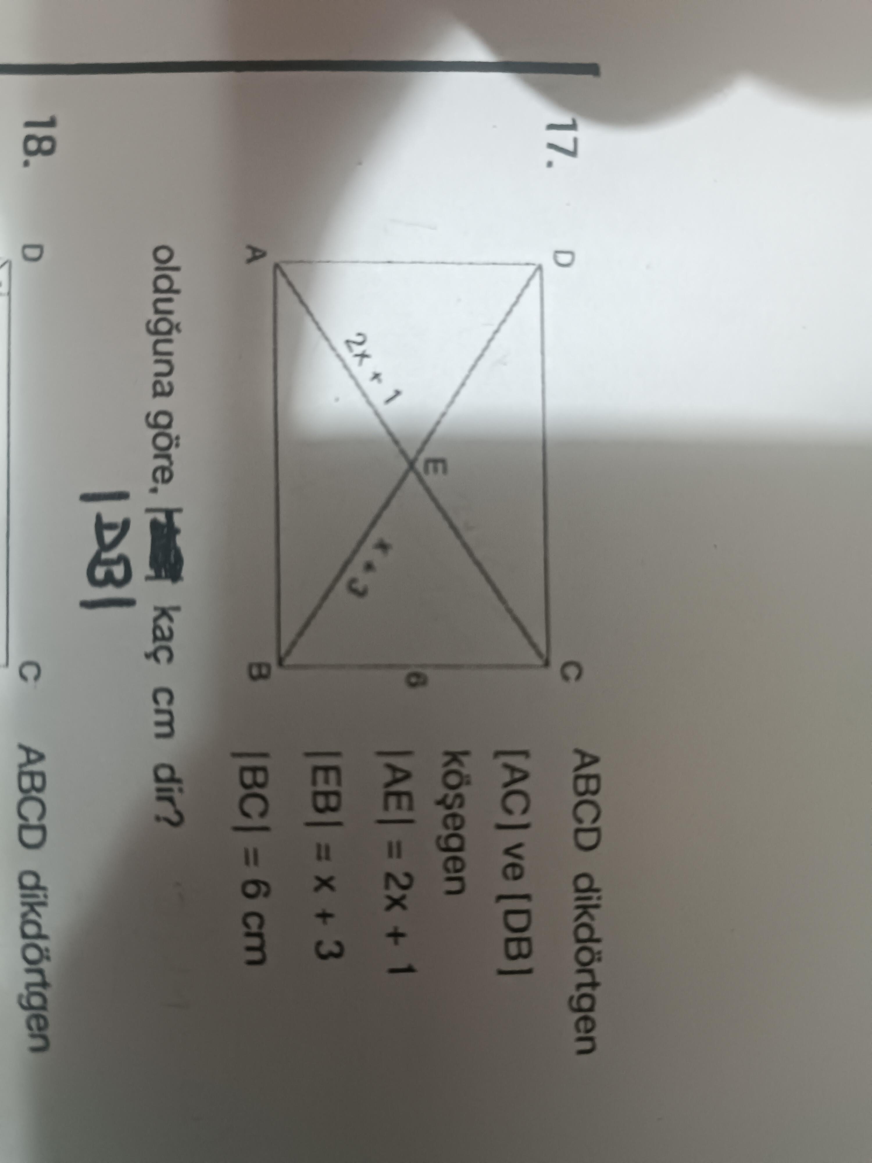 ABCD bir dikdörtgendir. “AC” ve “DB” köşegen olup, kesişim noktaları E’dir. Verilenlere göre “AE = 2x + 1” cm, “EB = x + 3” cm ve “BC = 6” cm’dir. Soru, “DB” köşegeninin uzunluğunu bulmaktır.