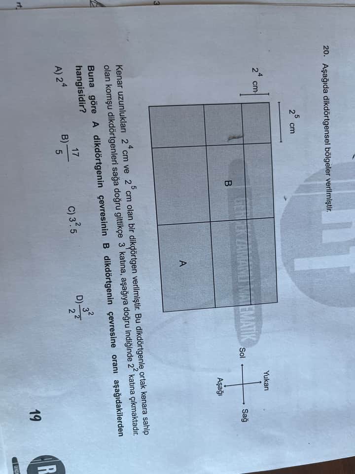 20. Aşağıda dikdörtgensel bölgeler verilmiştir. Buna göre A dikdörtgeninin çevresinin B dikdörtgeninin çevresine oranı aşağıdakilerden hangisidir?