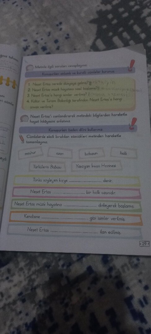 DMetide gl sorular cvoploynz Konuien anlanl ve kurall eomlaler kuruua Nevet Erto 2 Neet Ertoy mork hoyatno o nosl basloms?f 3. Neset Ertas’a hang isler verlmig? Cubn 4 Koltar ve Turizm Bokorlg torafindan Neset Ertas’a hangl nerede diryaya gel? thhhyh Gnvon verdmi? Neget Ertop’ conlandirarak metindeki blqilerden hareketle hayot hikayesini anlatiniz. meshur Cümlelerde eksik broklan sözcüklerl metinden hareketle tamamlayinz. Konusurken beden dilni kullanınz. Torkulerin Babos Tirai söule.en ksye Neset Ertas Kendisine .. Neşet Ertas bobasin Yascyan Irsan Hezinesi denir bir halk ozondir. Neset trtas müzik hayatina mnnen. dinleyerek başlamis holk qlbl isimler verilmis. lan edilmis. 29