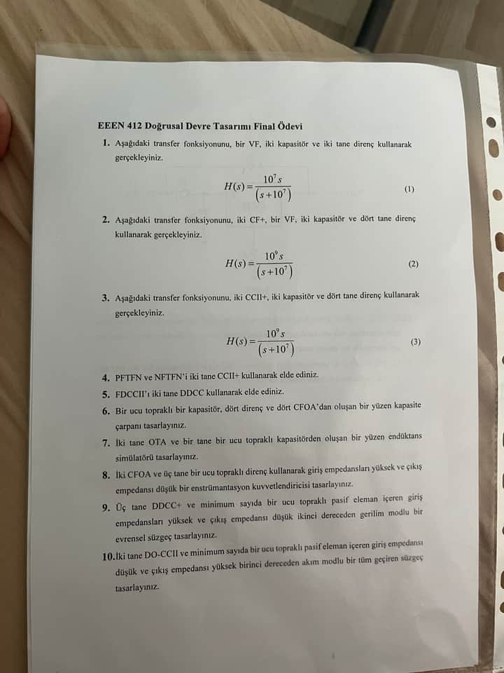 Aşağıdaki, paylaşmış olduğunuz 10 maddelik final ödevi sorularıdır. Bunlar, doğrusal devre tasarımı kapsamındaki transfer fonksiyonlarının, aktif devre elemanlarıyla (VF, CCII+, DDCC, CFOA vb.) gerçekleştirilmesi ile ilgilidir.