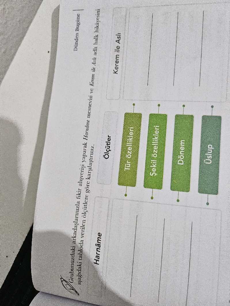 Dünden Bugüne VGruburnwzdaki arkadaşlarmzla fkır ahşverişi yaparak Harnáne mesnevisi ve Kerem ile Ash adlı halk hikâyesinı asağmdaki tabloda verilen ölçütlere göre karşılaştırmz. Harnâme Ölçütler Kerem ile Aslı Tür özelikleri Sekil özellikleri Dönem Üslup