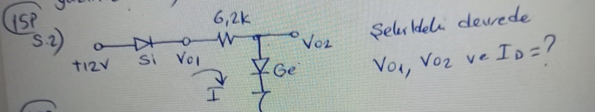 Aşağıdaki örnek devreye ilişkin açıklamaları sırasıyla inceleyelim. Devrede +12 V’luk bir kaynak, seri bağlı bir silikon diyot (Si), ardından 6,2 kΩ’luk bir direnç ve toprak (ground) tarafına doğru da bir germanyum diyotu (Ge) bulunmaktadır. Soru, V₀₁, V₀₂ ve I_D değerlerini istemektedir. Genellikle silisyum diyot için yaklaşık 0,7 V, germanyum diyot için yaklaşık 0,3 V ileri yön gerilim düşümü kabul edilir.