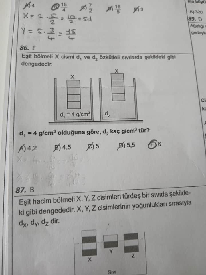- Sağdaki sıvıda cismin 1 bölmesi batıyorsa, aynı cismin yoğunluğundan yola çıkılarak d₂ = 6 g/cm³ bulunur.