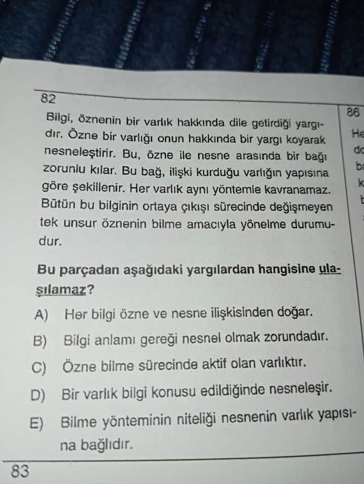 Bu bağlamda soruya göre, metinden çıkarılamayan yargı şıkkı (B) seçeneği “Bilgi anlamı gereği nesnel olmak zorundadır.” ifadesidir. Çünkü metinde bilginin nesnelleşmesinden bahsedilse de, bunun bilginin zorunlu bir niteliği olup olmadığına dair bir ifade yoktur.