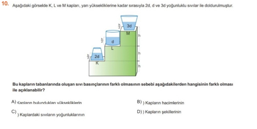 Soru: Aşağıdaki görselde K, L ve M kapları, yarı yüksekliklerine kadar sırasıyla 2d, d ve 3d yoğunluklu sıvılar ile doldurulmuştur. Bu kapların tabanlarında oluşan sıvı basınçlarının farklı olmasının sebebi aşağıdakilerden hangisinin farklı olması ile açıklanabilir?