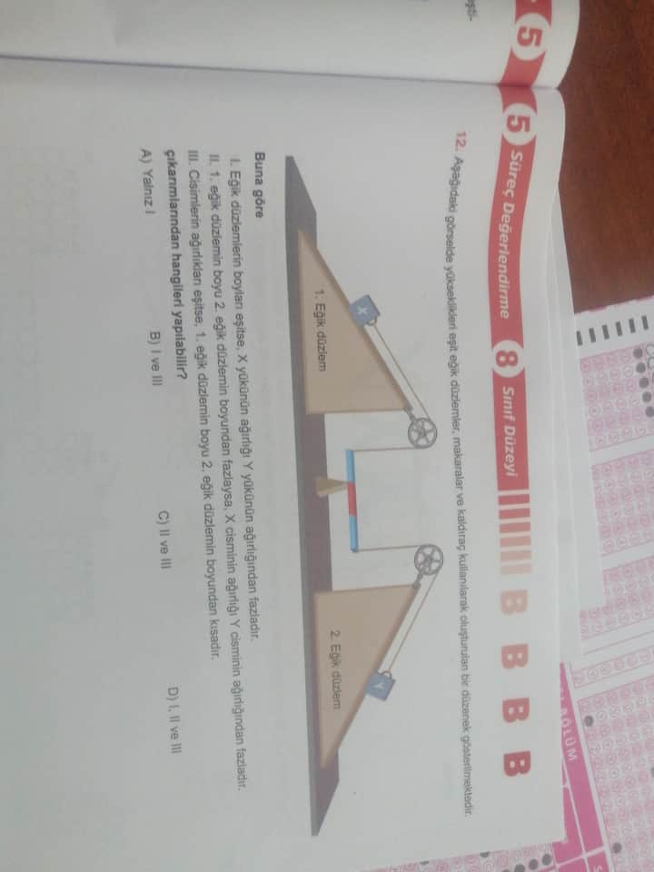 Resimde, “yükseklikleri eşit eğik düzlemler” yer almakta ve hangi düzenlemeler yapılırsa X ve Y yüklerinin ağırlıkları arasında farklılık yaratılabilir sorulmaktadır. Şıklarda verilen düzenlemeler üzerinde düşünülerek doğru seçenek belirlenmelidir.