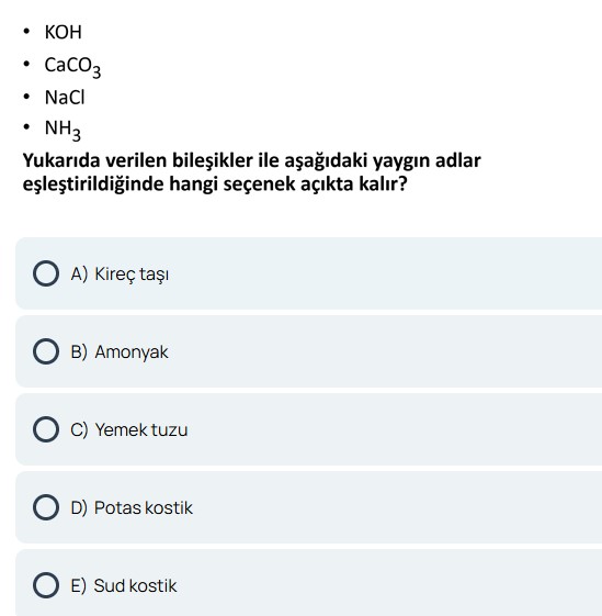 Verilen bileşikler (KOH, CaCO₃, NaCl, NH₃) sırayla potas kostik, kireç taşı, yemek tuzu ve amonyak olarak adlandırılır. Sud kostik ise NaOH formülüne sahip olup listede yer almadığından herhangi bir bileşiğe karşılık gelmez ve dolayısıyla E) Sud kostik seçeneği eşleşemeyerek açıkta kalır.