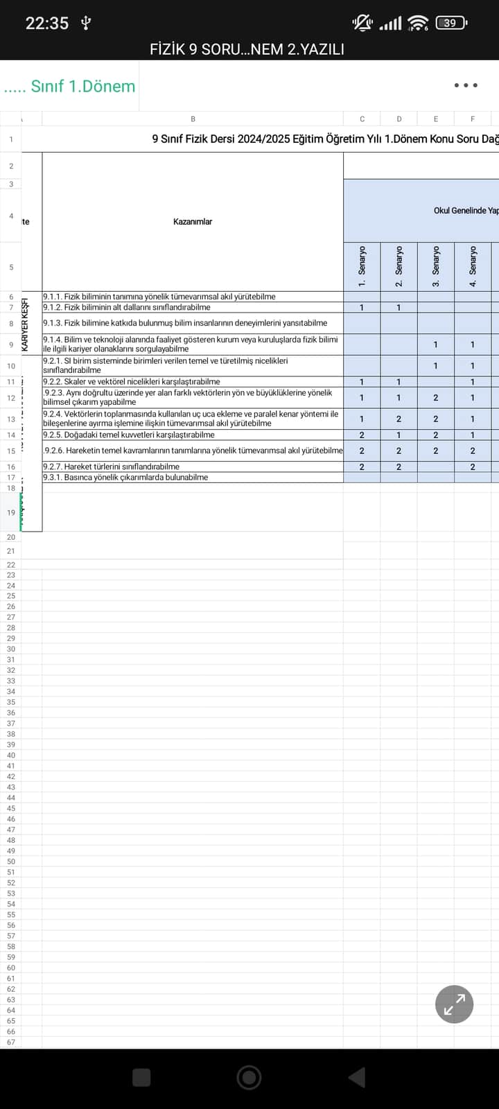 Görsele göre, konu 9. sınıf fizik dersi 1. dönem konularını ve kazanımlarını içeriyor. Burada çeşitli senaryolara dayalı sorular yer alıyor. Kazanımlar, fizik biliminin tanımından, vektörlerin toplanmasına kadar çeşitlilik göstermektedir. Fizik biliminin farklı alt dallarının sınıflandırılması, bilim insanlarının deneyimlerinin yansıtılması gibi konular işlenmiş. Ayrıca, SI birim sistemi, skaler ve vektörel nicelikler gibi temel fizik kavramlarına da odaklanılmış. Bu kazanımlar, öğrencilere fizik konularında kapsamlı bir anlayış kazandırmayı amaçlıyor.