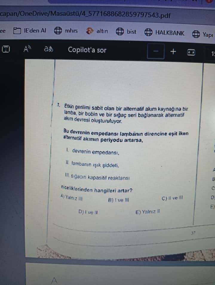 Soruda etkin gerilimi sabit olan bir alternatif akım kaynağına bir lamba, bir bobin ve bir sığaç seri bağlanarak alternatif akım devresi oluşturuluyor. Sorudaki kritik bilgiler: