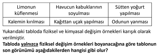 Yukarıdaki tabloda fiziksel ve kimyasal değişim örnekleri karışık olarak verilmiştir. Tabloda yalnızca fiziksel değişim örnekleri boyanacağına göre son görünüm aşağıdakilerden hangisi gibi olur?