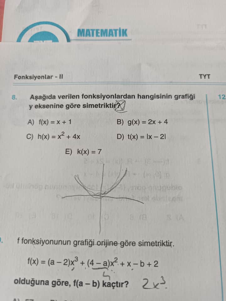 Aşağıdaki soru ve görsellere dayalı olarak: “Verilen fonksiyonlardan hangisinin grafiği y eksenine göre simetriktir?” ve “Orijine göre simetrik olan bir fonksiyonun parametreleri bulunduktan sonra f(a-b) nedir?” konularını detaylı biçimde ele alalım.
