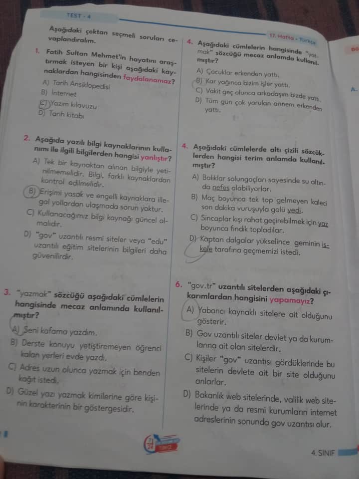 Konu: Türkçe Çoktan Seçmeli Soruların Cevapları