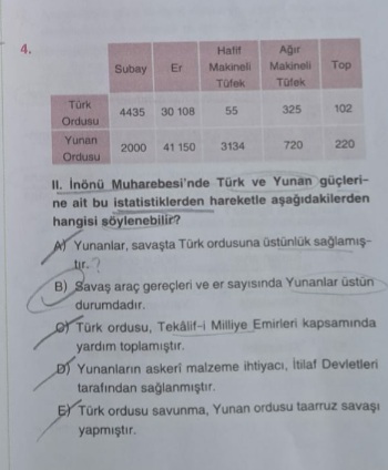 | Subay sayısı konusu | Türk ordusu subay sayısında önde (4435 > 2000). Ancak soru er ve ekipman üstünlüğünü vurguladığı için mevcut tabloya göre (B) seçeneği doğrudur. |