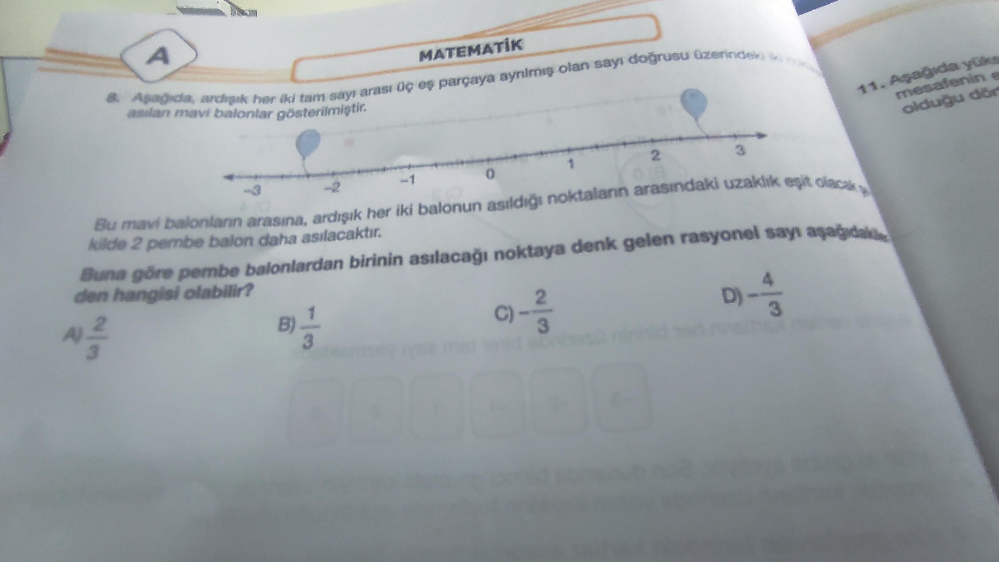 Pembe balonlardan biri kesinlikle -\tfrac{2}{3}, diğeri \tfrac{2}{3} noktasındadır. Soru, “pembe balonlardan birinin asılacağı nokta hangisi olabilir?” diye sorduğuna göre, seçenekler arasında hem -\tfrac{2}{3} (C) hem de \tfrac{2}{3} (A) yer alır. Fakat genellikle yalnızca bir doğru seçenek işaretlenebilir. Resimdeki balonların pozisyonuna göre, pembe balonlardan orta iki balon pozisyonu -\tfrac{2}{3} ve $\tfrac{2}{3}$’tür.