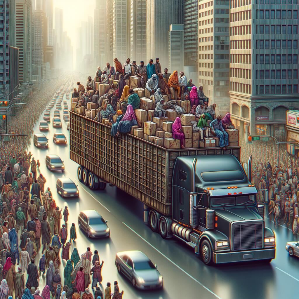 A truck carrying many people, symbolizing migration, in a busy urban setting, vibrant and realistic.