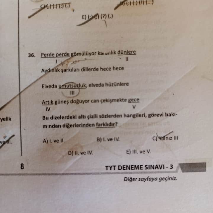 Verilen dizelerde çeşitli sözcüklerin altı çizilmiştir. Soruda bu altı çizili sözcüklerden hangilerinin (örneğin I, II, III, IV, V gibi numaralarla gösterilmiş) görevi (işlevi) bakımından diğerlerinden farklı olduğu sorulmaktadır.