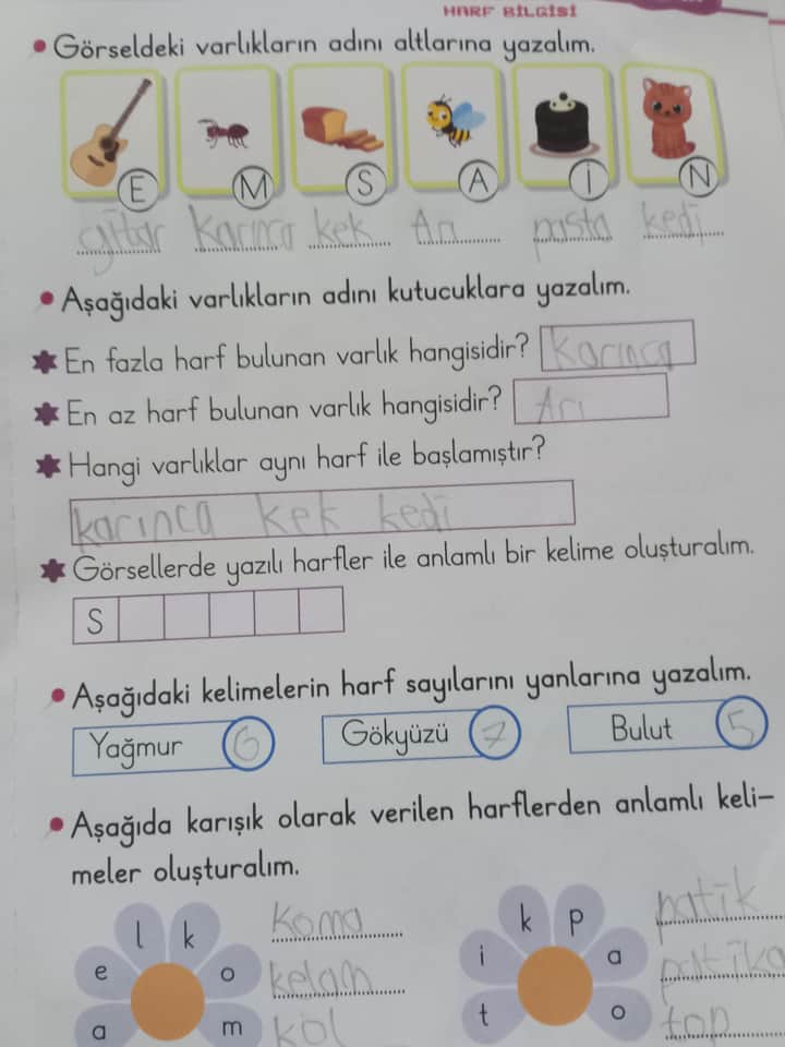 Paylaştığınız görseldeki varlıklara (gitar, karınca, kek, arı, pasta, kedi) rastgele harfler verilmiş olabilir. Fotoğrafta yer alan harf kümelenmesinin E, M, S, A, I, N şeklinde sıralandığı görülüyor. Görevimiz bu harflerle anlamlı bir Türkçe kelime oluşturmak. Etkinlik yönergesine bakıldığında: