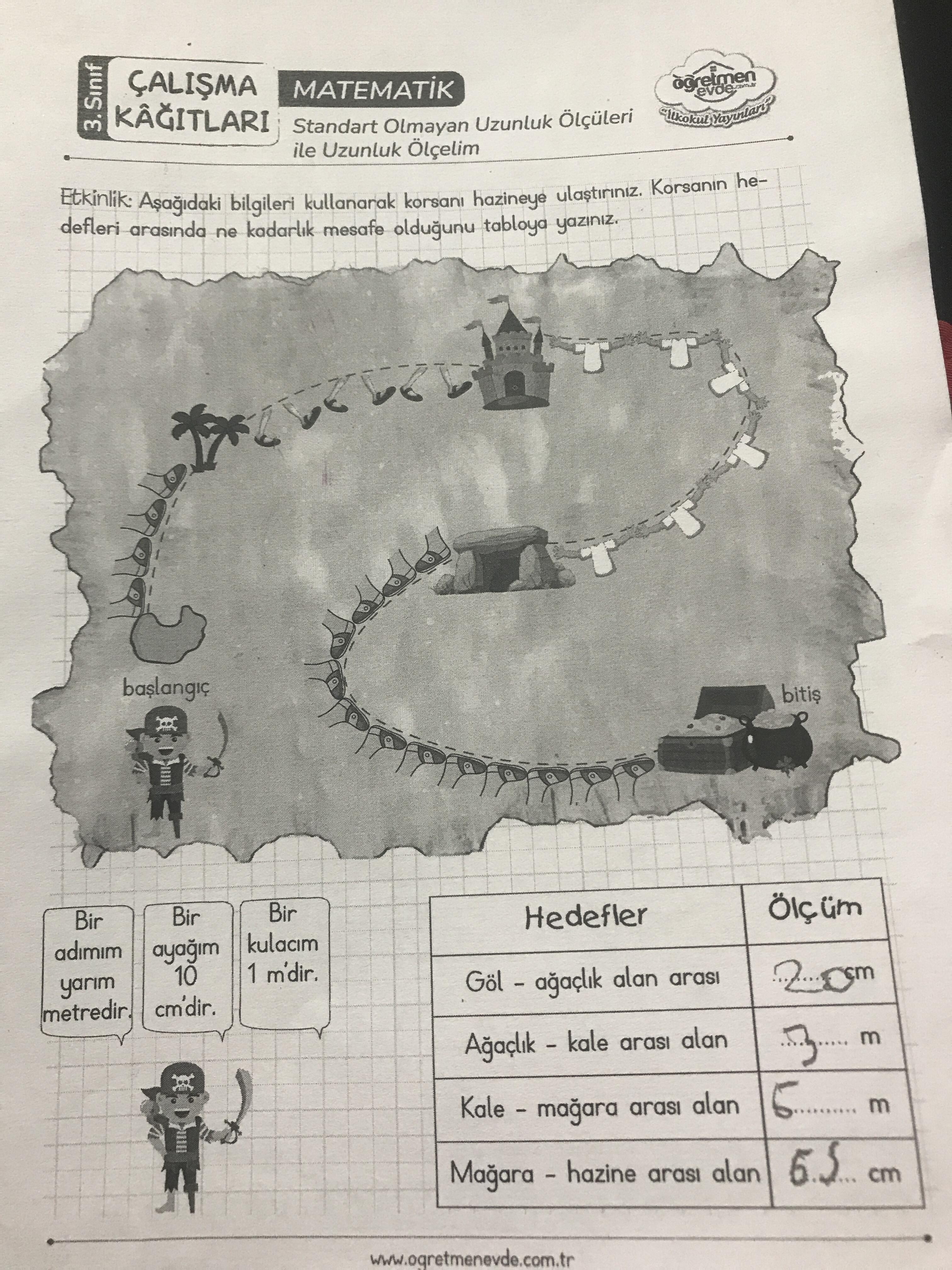 Bu çalışma kağıdı, 3. sınıf matematik konularından biri olan standart olmayan uzunluk ölçüleri ile ilgilidir. Korsan temasıyla hazırlanan etkinlikte, öğrencilerin klasik “metre, santimetre” gibi ölçü birimlerinin yanı sıra “adım”, “ayak” ve “kulaç” gibi başka uzunluk ifadelerini kullanarak tahminde bulunması, dönüştürme yapması veya ölçüm mantığını kavraması istenir.