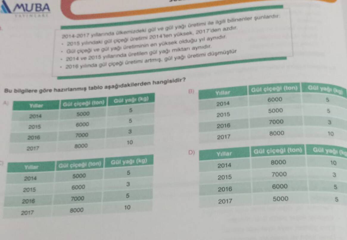 - A ve B seçeneklerinde: 2015 yılındaki gül çiçeği üretimi 2014’ten az gösterilmiş, dolayısıyla bu yanlış.