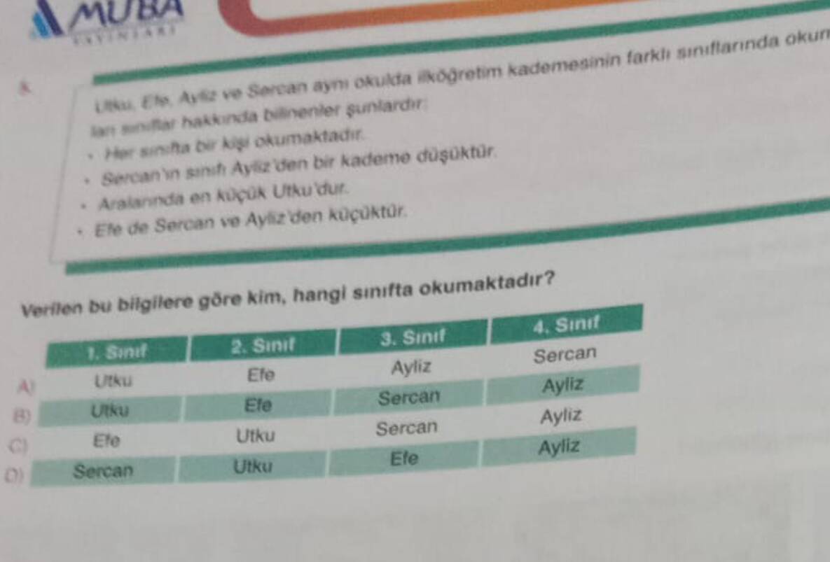 - Utku, en küçük olduğundan 1. sınıfta olmalıdır.