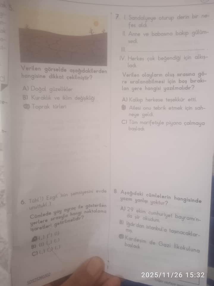 | 6 | Noktalama işaretleri | A) ! , ( ) ( ) | Ünlem, virgül ve parantez doğru yerlerde kullanılmalı |