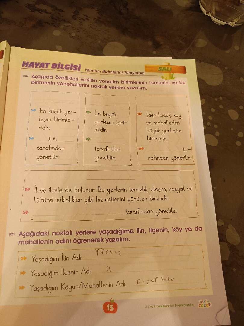 HAYAT BILGISI Yonetim Birimlerini Tonıyorum Aşagida özellikleri verilen vönetim birimlerinin isimlerini ve Du birimlerin yöneticilerini noktalı yerlere yazalim. En küçük yer- leşim birimle- ridir. tarafindan yönetilir: En büyuk Yaşadiğım lin Ad: yerleşim biri- midir. Yasaciğım leenin Adi tarafindan yönetilir. SALI Yaşodğım Koyün/Mahallenin Ad lden küçuk, köy 13 ve mahalleden l ve ilçelerde bulunur Bu yerlerin temizik, ulaşım, sosyal ve kültürel etkinlikler qibi hizmetlerini yúrüten birimdir. büyuk yerleşim birimidir. Aşağıdaki noktalı yerlere yaşadığımz ilin, ilçenin, köy ya da mahallenin adını öğrenerek yazalim. ta- ratindan yönetilir. tarafindan yönetlir. HAKIM, 2 Sind 2. Dônem Aru Tatit Çalgma Yoproklar Cocuk