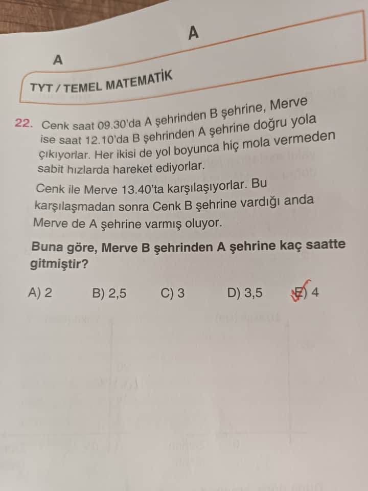 Ama hayır! Soruya göre, Cenk saat 09.30’da A’dan B’ye çıkıyor. Merve saat 12.10’da B’den A’ya çıkıyor, 13.40’da karşılaşıyorlar.