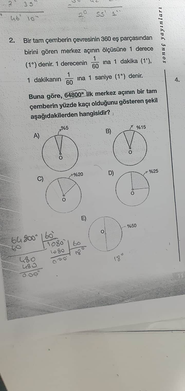 Sonuç olarak, 64800" lik merkez açı, tam bir çemberin (%5)'ine denk gelir. Şıklar arasında bu da %5 şeklinde gösterilmiştir.